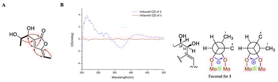 (A) COSY and key HMBC correlations in 1; (B) induced circular dichroism (ICD) spectra from the Mo2-complex and inherent CD of 1.