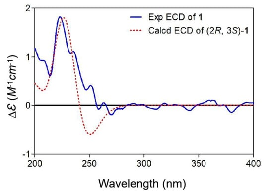 Experimental electronic circular dichroism (ECD) spectrum of 1 (blue solid); calculated ECD spectrum of (2R, 3S)-1 (UV correction = −19 nm, red dash) at the CAM-B3LYP-SCRF/def2-SVP//B3LYP/6-31G(d) level of theory in MeOH with IEFPCM solvent model (Polarized Continuum Model using the Intergral Equation Formalism).