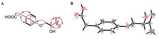 Compound 2 was acquired as colorless needles. The molecular formula C13H16O4 was established on the basis of (+)-HRESIMS data at m/z 254.1389 ([M + NH4]+) and 259.0942 ([M + Na]+). The 1H and 13C NMR data (Table 1), in combination with the HSQC spectrum, displayed signals that were attributed to one methyl at δH 1.72 (s, H-5’) and δC 18.9 (C-5’); three methylenes, including one oxygenated sp3 at δH 3.92 (dd, J = 9.9, 4.4 Hz, H-1’α), 3.84 (m, H-1’β), and δC 71.3 (C-1’), one sp3 at δH 3.46 (br s, H-7) and δC 40.2 (C-7), and one exocyclic sp2 at δH 4.86 (br s, H-4’α), 5.02 (br s, H-4’β) and δC 112.1 (C-4’); five methines, including four sp2 at δH 7.14 (d, J = 8.3 Hz, H-2/6), 6.86 (d, J = 8.4 Hz, H-3/5), δC 130.8 (C-2/6), 114.8 (C-3/5), and one sp3 at δH 4.24 (t, J = 5.3 Hz, H-2’) and δC 72.7 (C-2’); three non-protonated sp2 carbons at δC 127.4 (C-1), 157.8 (C-4), 145.8 (C-3’), and one carbonyl carbon at δC 173.4 (C-8). The above-mentioned spectroscopic features as well as the COSY correlation between H-2/6 and H-3/5 (Figure 4A) were interpreted as characteristic for a para-substituted aromatic ring. Besides, H2-1’ and H-2’ were coupled as evidenced by the COSY correlation (Figure 4A). The key HMBC correlations from H3-5’ to C-2’, C-3’, and C-4’, from H2-1’ to C-3’, and from H-2’ to C-4’ and C-5’ delineated an unsaturated and hydroxylated isoprene unit, (2-hydroxy-3-methylbut-3-en-1-yl)oxy (Figure 4A). Additional HMBC correlation from H2-1’ to C-4 showed that the isoprene unit was connected to the para-substituted aromatic ring via an oxygen atom. Furthermore, the interactive HMBC correlations from H2-7 to C-2, C-6, and C-8 constructed the other group (C7‒C8) linked to the aromatic ring. The planar structure of 2 was therefore determined. A literature search revealed that it possessed the same planar structure as stachyline B, a secondary metabolite previously isolated from the sponge-derived fungus Stachylidium sp. []. The configuration at C-2′ of stachyline B was determined as S by Mosher’s method []. Since 2 possessed the opposite sign of the optical rotation when compared to that of stachyline B (+16.1 in 2 vs −12 in stachyline B), the R configuration was proposed for C-2′ of 2. X-ray diffraction crystallographic analysis enabled us to undoubtedly confirm its absolute configuration (Figure 4B).
