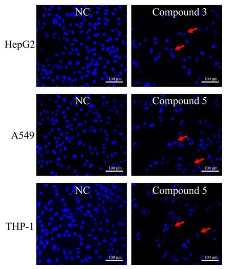 The isolated compounds 1–8 were submitted to Cell Counting Kit-8 (CCK-8) colorimetric assays toward six human carcinoma cell lines (human lung adenocarcinoma epithelial cell line A549, human breast cancer cell line BT-549, human cervix carcinoma cell line HeLa, human liver carcinoma cell line HepG2, human breast adenocarcinoma cell line MCF-7, and human monocytic cell line THP-1) to estimate their cytotoxicities. Compound 3 exhibited cytotoxicity to the HepG2 cell line with an IC50 value of 22.0 μM. Furthermore, 5 also showed considerable activities against the A549 and THP-1 cell lines with IC50 values of 21.2 and 18.2 μM, respectively (Table 2). To determine whether the compounds could induce apoptosis, 4’,6-diamidino-2-phenylindole (DAPI) staining was conducted using a confocal laser scanning microscope. We found that many cells had typical apoptotic features, such as fragmented/condensed nucleus and apoptotic body formation (Figure 5). All staining results indicated that 3 and 5 had apoptosis-inducing activity against the HepG2, A549, and THP-1 cell lines, respectively.