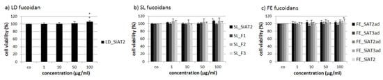 The same procedure was performed for the human RPE cell line ARPE-19 (Figure 2). Cell viability was determined after 24 h with the MTS assay. Again, none of the fucoidan displayed significant antiproliferative effects. SiAT2 extracts from all three seaweed species, increased cell viability slightly at 100 µg/mL, again, although under 10% difference compared to control and therefore not biological relevant.