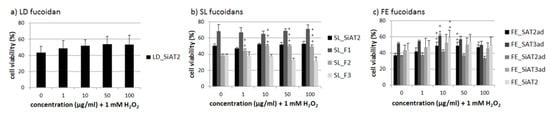 OMM-1 cell survival after 30 min treatment with LD fucoidan (a), SL fucoidans (b) and FE fucoidans (c) and 24 h stress insult with 1 mM H2O2, which reduced cell viability to at least 60% in all cases. Viability was determined with MTS assay. Values are pictured as the mean and standard deviation in relation to an untreated control (100%). Significance was evaluated via ANOVA; + p < 0.05, ++ p < 0.01, +++ p < 0.001 versus 0 µg/mL fucoidan + 1 mM H2O2 (n ≥ 4, number of independent experiments).