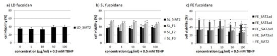 One role of RPE cells is to limit the oxidative stress in the human retina [4]. ARPE-19 cells as an RPE cell line are very resistant against hydrogen peroxide [26]. Therefore we used 0.5 mM tert-butyl hydroperoxide (TBHP) to lower the cell viability of ARPE-19 significantly after 24 h, as previously shown [19]. Again, the LD fucoidan showed no significant effect (Figure 4). Some of the FE fucoidans also had a slight additional toxic effect at 50 and 100 µg/mL, while 10 µg/mL FE_SAT2ad, FE_SiAT2ad and FE_SiAT3ad had a minimal protective effect. FE fucoidan at 10 µg/mL seems to be the best concentration concerning oxidative stress protection, but the effects are small and not relevant, corresponding to the fact that ARPE-19 are rather resistant against oxidative stress on their own and are hardly affected by fucoidan extracts [17,19]. SL_F2 and SL_F3 at concentrations of 50 µg/mL slightly decreased cell viability significantly down to 47% ± 3, p < 0.05 and 49% ± 2%, p < 0.05, respectively compared to 54% ± 3% stress control, but this not likely to be biological relevant. Otherwise, there were no significant effects for the SL fucoidans.