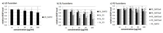 Secreted VEGF (vascular endothelial growth factor) of ARPE-19 after three days of incubation with 1, 10, 50 and 100 µg/mL LD fucoidan (a), SL fucoidans (b) and FE fucoidans (c). VEGF amount was determined with ELISA and normalized to cell survival, making a quotient of VEGF and cell viability. 10–100 µg/mL LD_SiAT2 and 1–100 µg/mL SL_F2 and SL_F3 decreased VEGF significantly. Significant values were analyzed with ANOVA, * p < 0.05, ** p < 0.01, *** p < 0.001 compared to the control (n ≥ 4, number of independent experiments).