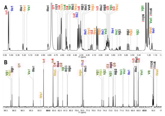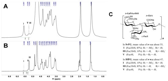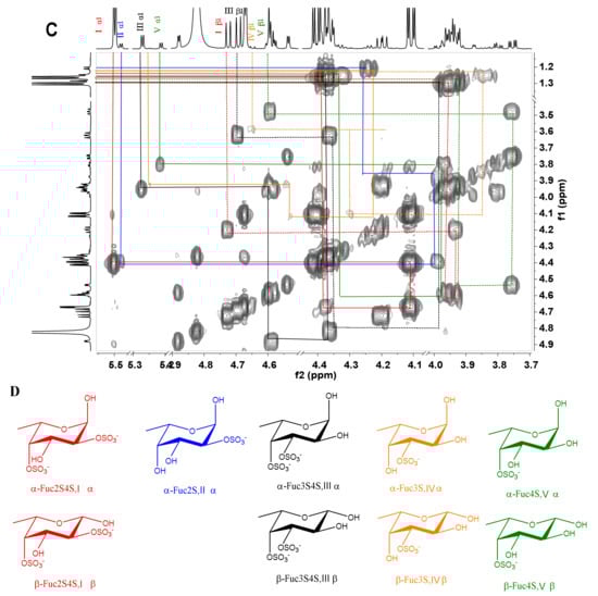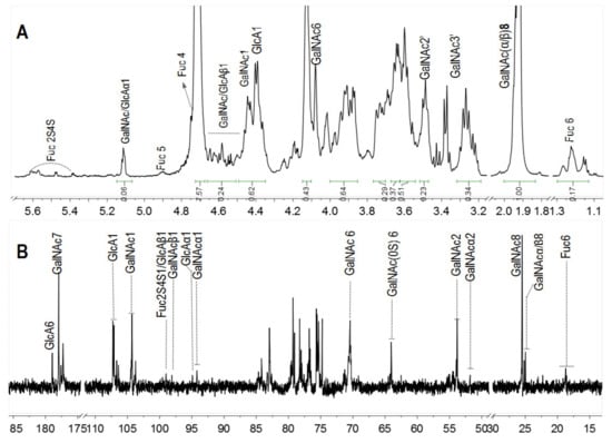 - Santos, G.R.; Porto, A.C.; Soares, P.A.; Vilanova, E.; Mourão, P.A. Exploring the structure of fucosylated chondroitin sulfate through bottom-up nuclear magnetic resonance and electrospray ionization-high-resolution mass spectrometry approaches. Glycobiology 2017, 27, 625–634. [Google Scholar] [CrossRef]