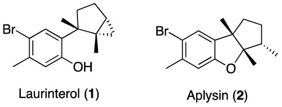 Among marine organisms, algae of the genus Laurencia are considered one of the richest sources of novel compounds with a wide range of bioactive properties, such as the brominated sesquiterpenes laurinterol (1) and aplysin (2) (Figure 1) []. Laurinterol has been evaluated for its antibacterial [,,], cytotoxic [,,], antifouling [], anti-Acanthamoeba [], Na/K ATPase inhibition [], insecticidal, and repellent properties []. Meanwhile, aplysin has shown moderate cytotoxic activity and has been evaluated for its mechanisms of action in different biological models [,,,].