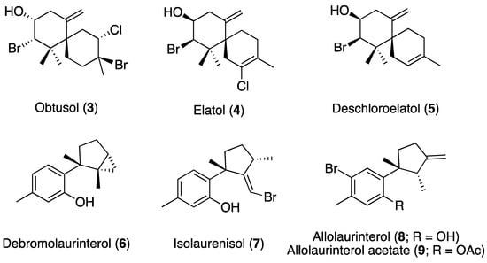 Despite the urge to find new anti-NTM treatments, marine natural products have been weakly evaluated; Biá Ventura et al. investigated the antimycobacterial activity of two extracts of Laurencia dendroidea and three of its halogenated sesquiterpenes against Mycobacterium bovis, noting obtusol (3) with a half-maximal inhibitory concentration (IC50) of 31.4 µg/mL [].