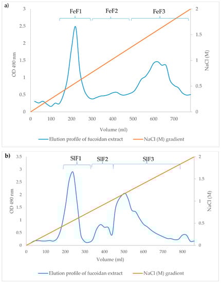 The elution profile of ion-exchange chromatography (IEX) fractionated fucoidan. (a) Elution profile for the F. evanescens chromatography purificatonand. (b) Elution profile for the S. latissima fucoidan during IEX. Based on the elution profile, three extracts FeF1–F3 and SlF1–F3 were collected from the F. evanescens and S. latissima purifications, respectively.