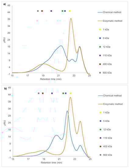 SEC chromatogram of crude fucoidans from chemical and enzyme-assisted purification. (a) F. evanescens and (b) S. latissima. Pullulan was used as standard.