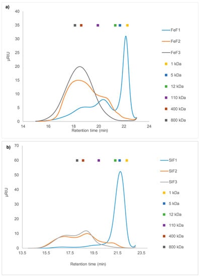 SEC chromatogram of fucoidan fractions after IEX purification. (a) F. evanescens: the FeF1 fraction contains LMW compounds of around 2 kDa and a smaller proportion of HMW compounds between ~100–500 kDa, while FeF2 and FeF3 contain primarily HMW compounds ranging from ~400 kDa to ~800 kDa; (b) S. latissima: the SlF1 fraction contains almost exclusively LMW compounds of around 5 kDa, while SlF2 and SlF3 contain more HMW compounds ranging from ~300 kDa to over 800 kDa. Pullulan was used as standard.