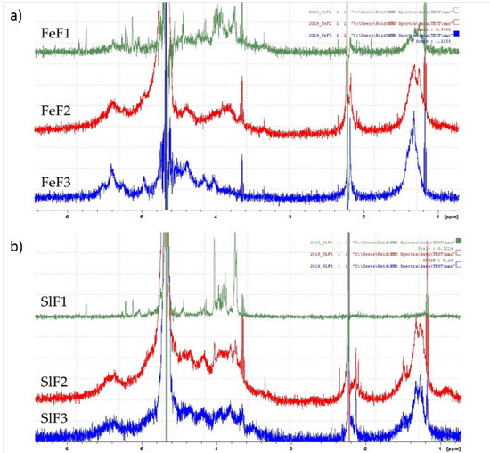 1H NMR spectra of fucoidan fractions. (a) F. evanescens (FeF1, FeF2, FeF3) and (b) S. latissima (SlF1, SlF2, SlF3) in D2O.