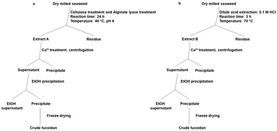 The chemical extraction of crude fucoidans was performed in 0.1 M HCl solution with a ratio of seaweed to extracting liquid of 1:20 and treatment for 3 h at 70 °C (methodology modified from Ale et al. 2012 [53]). The supernatant (Extract A, Figure 5a)) was collected by centrifugation for 10 min. at 19000 rpm. Next, 2% CaCl2 solution was added to remove alginate as a precipitate after centrifugation (Figure 5). The crude fucoidans were isolated from the supernatant by 72% ethanol (EtOH), recovered by centrifugation at 19000 rpm for 30 min, and lyophilized. The latter steps were comparable to the enzyme-assisted extraction method (Figure 5).