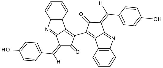 Recently, cyanobacterial metabolites called attention to their biotechnological and industrial significance and have been exploited by pharmaceutical and cosmetic industries. Scytonemin, a cyanobacterial metabolite, is a small hydrophobic pigment molecule present in the extracellular sheath of certain strains of cyanobacteria and has been known to exert a protective role against solar ultraviolet (UV) radiation []. This pigment is a dimeric molecule of indolic and phenolic subunits (Figure 1) and has the ability to reduce the production of reactive oxygen species and the formation of DNA lesions [,]. Scytonemin has also been reported to exert a variety of biological activities, including antioxidant and anti-proliferative activities [,].