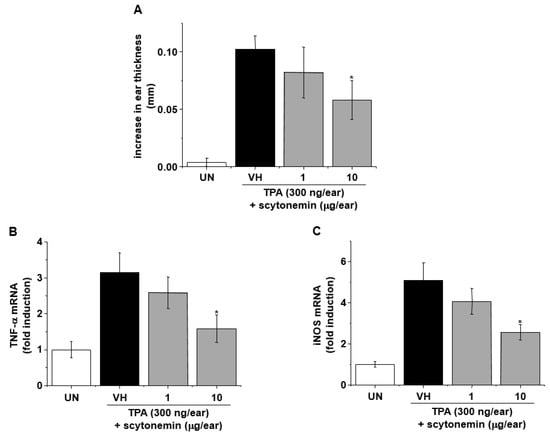 To investigate the anti-inflammatory effect of scytonemin in vivo, we examined the effect of topically applied scytonemin on TPA-induced ear swelling in BALB/c mice. Topical application of TPA (300 ng/ear) induced ear swelling after 4 h in BALB/c mice, and TPA-induced increase in ear thickness was significantly suppressed by scytonemin treatment (Figure 2A). To further investigate, we also examined the effect of topically applied scytonemin on TPA-induced gene expression of inflammatory mediators using ear biopsies. As shown in Figure 2B,C, scytonemin significantly down-regulated the gene expression of TNF-α and iNOS in the TPA-treated ear of BALB/c mice.