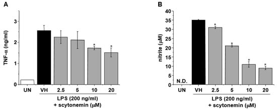 Effect of scytonemin on the production of TNF-α and nitrite in LPS-stimulated RAW 264.7 cells. RAW 264.7 cells were pretreated with the indicated concentrations of scytonemin for 1 h before being incubated with LPS (200 ng/mL) for 24 h. The culture supernatants were collected, and the levels of TNF-α (A) and nitrite (B) were measured. Each column shows the mean ± SD of triplicate determinations. Significance was determined using Dunnett’s t-test versus the control group (* p < 0.05). ND = not detected.
