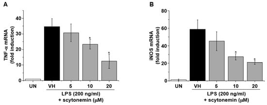 To further investigate whether the inhibitory effect of scytonemin on the production of TNF-α and NO in LPS-stimulated RAW 264.7 cells are due to the inhibitory effect of scytonemin on the mRNA expression of cognate genes, the effect of scytonemin on LPS-induced mRNA expressions of TNF-α and iNOS were assessed by quantitative RT-PCR. As shown in Figure 4A,B, LPS markedly induced the mRNA levels of TNF-α and iNOS, and this induction was dose-dependently inhibited by scytonemin treatment in RAW 264.7 cells.