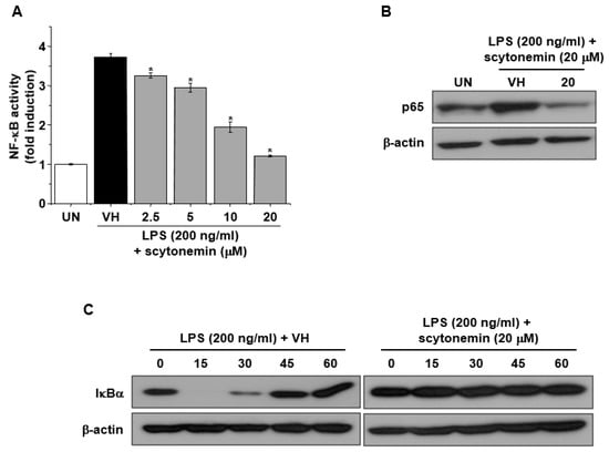 Effect of scytonemin on NF-κB activation, p65 nuclear translocation, and IκBα degradation in LPS-stimulated RAW 264.7 cells. (A) RAW 264.7 cells were transiently transfected with pNF-κB-Luc containing five copies of the NF-κB/Rel binding site, treated with the indicated concentrations of scytonemin, and LPS (200 ng/mL) for 24 h, and assayed for luciferase expression using a luciferase assay kit. (B) RAW 264.7 cells were pretreated with the indicated concentrations of scytonemin for 1 h, incubated with LPS (200 ng/mL) for 30 min, and then assayed for the nuclear translocation of p65 by Western immunoblot analysis. (C) RAW 264.7 cells were pretreated with 20 μM of scytonemin for 1 h, incubated with LPS (200 ng/mL) for the indicated times, and then assayed for the degradation of IκBα by Western immunoblot analysis.