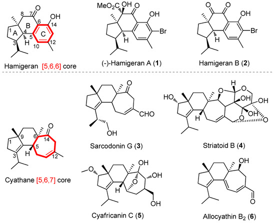 Selected structures of hamigerans (1–2) and cyathanes (3–6).