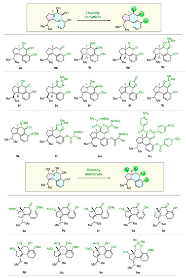 The hamigeran B skeleton-based derivatives 9b–n and 1-hydroxyl-9-epi-hamigeran B-based 9o-w obtained (Figure 2) were prepared according to the methods in the section of Materials and Methods. Protecting the hydroxyl of 9a afforded the corresponding compound 9h-n. Hydrogenation of 9h and 9g proceeded very efficiently to provide the hydrogenated product 9c and 9e. The compounds 9h, 9m, and 9n were constructed via esterification from 9a. Hydrolysis and concomitant oxidation proceeded 9c to produce 9d, followed by the condensation which afforded 9g. Using trifluoroacetic acid to treat compound 9e afforded the product 9f. Compounds 9q and 9s were constructed via removing methyl on the phenolic group of 9o and 9r. The compound 9t was established through simply eliminating 1-Hydroxy of 9s. Protecting the hydroxyl of 9p afforded the corresponding compound 9u-w. There are also six annellation compounds (9e, 9g, 9i–j, 9l, 9w) and two trisubstituted ester molecules (9m bearing Boc-alaester and 9n bearing nitrobenzoate). After chromatographic purification, all compounds including 9a–w were subjected to spectroscopic analysis, and their structures and purity (≥95%) for biological analysis were confirmed by means of HRESIMS and 1H and 13C NMR analysis.