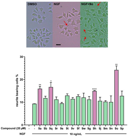 Effects of test compounds on neurite outgrowth in PC-12 cells after 72 h treatment. (top) Morphological characteristics of PC12 cell after treatment with compound 9o. (bottom) Percentage of neurite-bearing PC12 Cells. Cell with one or more neurites whose lengths were at least twice the diameter of the cell body were counted as neurite-bearing cells. The purple bars mean statistically significant compounds. In all panels, error bars indicate ± SD (n = 3). * p < 0.05, ** p < 0.01, *** p < 0.001, **** p < 0.0001 compared with the nerve growth factor (NGF) group.