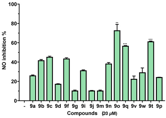 The inhibitory effects of the hamigeran B derivatives (9a–n) and 1-hydroxyl-9-epi-hamigeran B ones (9o–w) on LPS-stimulated NO production in BV2 cells were assessed according to our reported methods [32,33]. The results of inhibitory effects are depicted in Figure 4. As a result, most of the tested compounds showed inhibitory effects on NO production, and 9b–c, 9f, 9o, 9q, and 9t exerted significant effects, with IC50 values in the approximate range 5.8–24 μm. Among them, the most potent inhibitors, 9c (IC50 = 5.85 μm) and 9q (IC50 = 6.31 μm) showed a comparable inhibition potency to natural product quercetin (IC50 = 4.3 μm). The most important thing is that they can be cheaply stored and transported as the less deliquescent than quercetin.