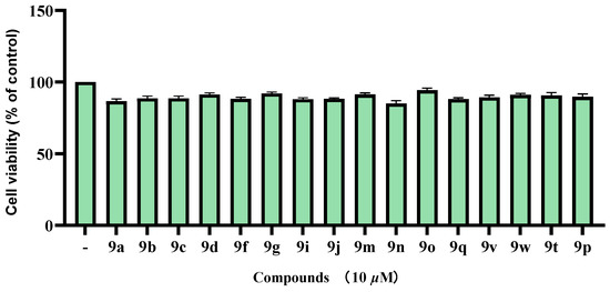 The effect on NO production could technically be due to toxicity on the cells. To exclude the possibility that their inhibitory activity was simply due to the cytotoxicity of the tested compounds, a cytotoxicity assay was conducted in BV-2 cells. As shown in Figure 5, when compared to the vehicle control at 10 μm, all 16 compounds failed to affect cell viability significantly. While the compounds display mild toxicity, the toxicity cannot account for the other observed effects. It is further proved that 16 compounds have certain anti-neuritis activity, which has nothing to do with cytotoxic activity.