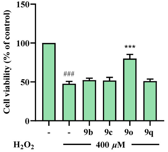 The accumulation of H2O2 can lead to amyloid production, dopamine oxidation, and cerebral ischemia. Therefore, the formed H2O2 can be easily converted into highly toxic hydroxyl radicals generated by Fenton’s chemical method to damage lipids, proteins, and DNA. The oxidative damage may lead to mitochondrial dysfunction, calcium imbalance, inflammation, and apoptosis of nerve cells [34]. At a concentration of 10 μm, compound 9o has better protective activity in the oxidative stress response of PC12 cells caused by H2O2 and other compounds have weak activity in Figure 6.