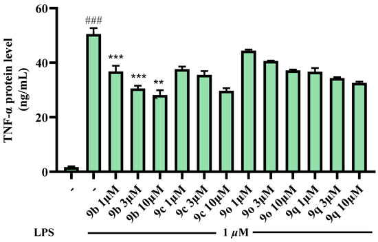 TNF-α is a cytokine produced in response to infection and is closely related to the NF-κB pathway in the inflammatory response [35]. Based on the above experiments, in order to further prove the anti-neuritis activity of 9b, 9c, 9o, and 9q, we used enzyme-linked immune response (ELISA) to determine the secretion of TNF-α in BV-2 cells stimulated by LPS under the action of the above compounds. When BV-2 were treated with different concentrations of 9b, 9c, 9o, and 9q, TNF-α was reduced to varying degrees in a dose-dependent manner in Figure 7.