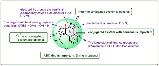 Based on the NO inhibition profile of these hamigeran B analogs (Figure 4), the structure-activity relationships (SARs) are summarized in Figure 8: (1) For whether hamigeran B or 9-epi-hamigeran B series, the [5,6,6]-tricarbocyclic system (ABC ring) is essential to activity, and introduction of an N-or O-heterocyclic ring (D ring) at C-7/C-8, or acylation or ether bond of three hydroxyl groups in 9a were detrimental to or led to a loss in activity (9e, 9g, 9k, 9w); (2) for hamigeran B series, hydrogenation of the double bond at C-3/C-4 is crucial to improved activity (9c IC50 = 5.85 μm) relative to 9h, hydrogenation of the keto group at C-8 enhanced activity (9f, IC50 = 24.91 μm vs. 9d, IC50 > 50 μm); for 9-epi-hamigeran B series, the presence of the phenol hydroxyl at C14 was important for activity (9q, IC50 = 6.31 μm vs. 9o, IC50 = 11.9 μm, the IC50 concentration curves in Supplementary Materials), and introduction of a large steric hindrance group (a sterically hindered group TBS), that is, TBS, at C-1 was able to highly increase activity (9o) compared to 9r; the large conjugated system with benzene-ring was important for enhancing the activity, for example, 9t (IC50 = 11.98 μm) with a conjugated cyclpentan-1,3-diene unit was far more active in comparison with 9s.