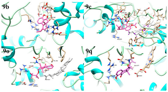 Molecular-docking simulations of 9b, 9c, 9o, and 9q into the iNOS binding site obtained in the lowest energy conformation.