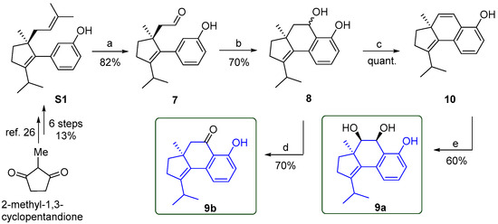 The synthetic route for the synthesis of the hamigeran B skeleton is illustrated in Scheme 1. The synthesis of diol 9a commenced with preparation of chiral phenolic compound 7 starting from precursor S1 which was prepared from a readily affordable 2-methyl-1,3-cyclopentanedione over six steps with 13% total yield, according to the previously reported protocol [26]. The compound S1 was treated by OsO4 and NaIO4 to give the aldehyde 7 a 70% yield, which was unstable in air [26]. The tricyclic compound 8 is envisioned as being constructed through a key intramolecular Friedel–Crafts cyclization of aldehyde 7 with 70% yield. The exclusively high regioselectivity may be attributed to the formation of a coordination intermediate, which fixes the nucleophilic site at the ortho position to the phenolic OH. The compound 8 was treated with PCC to give the oxidative product 9b in 70% yield. After obtaining the dehydrated intermediate 10, the regioselective dihydroxylation of the double bond in the central B ring of 10 with OsO4 and 4-methylmorpholine N-oxide (NMO) proceeded anti to the angular methyl group to give the diol 9a in 60% yield.