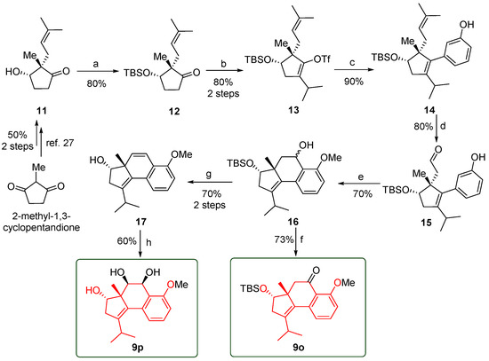The synthetic route for the synthesis of 1-hydroxyl-9-epi-hamigeran B intermediate is illustrated in Scheme 2. The synthesis of intermediate diol 9p, began with the known chiral cyclopentaneone 11 as the previous study [28]. Using imidazole and TBSCl to treat compound 11 afforded the α-hydroxy protected compound 12. Isopropylation of the compound 12 with i-PrI followed by a base enolization with LiHMDS and Comins’ reagent (PhNTf2 is comins’ reagent, named after a person, Daniel Comins) provided enol triflate 13 in two steps with 70% yield. For the coupled product 14, we preferred to examine the Suzuki cross-coupling of 13 with pinacol boronate instead of the corresponding boronic acid that was used previously in Trost’s synthesis [29]. Oxidation of the olefinic 14 was conducted by using a combination of OsO4 and NaIO4 to give 90% yield of the aldehyde 15, which was unstable in the air [26]. The compound 16 was envisioned as being constructed via an intramolecular Friedel–Crafts cyclization as the key reaction of 15 followed by protection of the phenol hydroxyl with MeI. We are failed to obtain the pure 16 as the by-product has the similar polarity. To our delight, the by-product can be removed next step. The compound 16 was affected by PCC to give the oxidative product 9o. A couple of enantiomers with ipsilateral dihydroxyl obtained by regioselective dihydroxylation of TBS protected 17 are difficult to purify. Therefore, the compound 17 were constructed through removing the protective group followed by dehydration. The regioselective dihydroxylation of the double bond in the B ring of 17 with OsO4 and NMO anti to the angular methyl group afforded the intermediate diol 9p. We have established a concise route for the synthesis of 1-hydroxyl-9-epi-hamigeran B cores 9p and 9o that proceeds via an eight-step sequence from the known ketone 11. To the best of our knowledge, this synthetic route represents the first time that can accomplish the synthesis of 1-hydroxyl-9-epi-hamigeran B intermediates within 10 steps from a known compound. Moreover, most of the transformations employed herein could be performed on multigram scale. This makes our synthetic route highly useful for mass production.