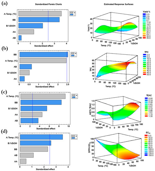 An ANOVA (analysis of variance) test was performed for each response variable, and the model adequacy was evaluated by the determination coefficient (R2) and the residual standard deviation (RSD) at a confidence level of 95% (p = 0.05). Response surface plots were developed using the fitted quadratic polynomial obtained, and the software from the fitted model provided the optimum conditions. Pareto’s diagrams, which point out the coefficients of the model that affect significantly the results together with the response surfaces, are shown in Figure 2. Following, the effects of the temperature and solvent composition on each of the response variables is discussed.