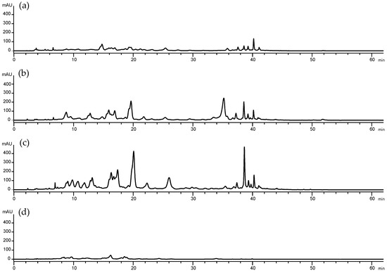 High-performance liquid chromatography coupled to a diode array detector (HPLC-DAD) chromatographic profile obtained at 450 nm from the PLE extracts carried out at (a) 180 °C, 100% EtOH (solvent composition); (b) 110 °C, 100% EtOH; (c) 40 °C, 100% EtOH; and (d) 110°C, 50% EtOH.