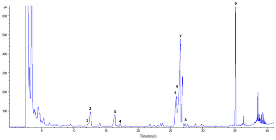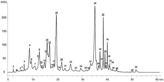 HPLC-DAD profile corresponding to the analysis of pigments obtained at 450 nm from an extract done at 110 °C and 100% ethanol. Carotenoids are represented with an underlined number and chlorophylls without underline.