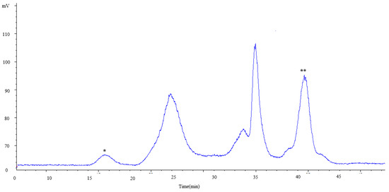 HPSEC-ELSD profile of the carbohydrate fraction corresponding to bioactive component extractions at 110 °C with 50% of EtOH. Peaks labeled as * and ** were out of the range of estimation of the method.