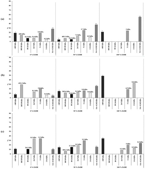 In order to estimate the molecular weight (Mw) of the carbohydrates present in the samples, a HPSEC-ELSD (high-pressure size-exclusion chromatography coupled to an evaporative light-scattering detector) analysis was carried out. The chromatographic profiles were different depending on the extraction conditions used, since the number of peaks varied from two to eight. Figure 5 shows, as an example, the profile corresponding to a sample subjected to an extraction at 110 °C with 50% of EtOH. As can be seen, several of the observed peaks, the first (labeled in Figure 5 as *) and the latter (labeled as **), were out of the range of estimation of the method, in agreement with conditions indicated in the Materials and Methods section. The peak with a maximum of 25 min corresponded to an average Mw of 506 kDa. Previous studies have reported that other species of Euglena (E. gracilis) possesses a β-glucan (paramylon) with a Mw of 500 kDa [28]. Therefore, it is plausible that this peak was due to paramylon. The other peaks could correspond to glycans different from paramylon with lower Mw. Although in E. gracilis, the major carbohydrate is paramylon, other more structurally complex polymers are also present [28]. Figure 6 provides detailed information about the distribution and abundance (under the chromatographic conditions here used) of the different carbohydrate fractions at different PLE conditions, according to the estimation of the Mw obtained by HPSEC-ELSD.