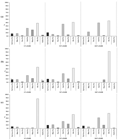 Distribution and abundance of the monomeric compositions (% over total carbohydrates) obtained by GC-FID after the hydrolysis with TFA of the extractions carried out at 40 (a), 110 (b), and 180 °C (c).