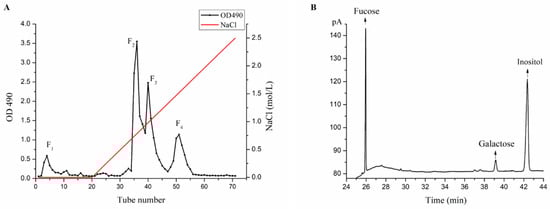 Purification and monosaccharide determination of fucoidan fractions: (A) elution profile of S. japonica crude fucoidan on DEAE-Sepharose Fast Flow anion exchange chromatography; (B) monosaccharide compositions of LJSF4 determined by gas chromatography.