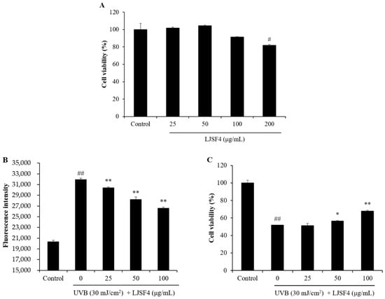 Protective effect of LJSF4 on UVB-induced HaCaT cells: (A) cytotoxicity of LJSF4 on HaCaT cells; (B) intracellular ROS level of UVB-irradiated HaCaT cells; (C) the viability of UVB-irradiated HaCaT cells. All experiments were performed in triplicate. Data are expressed as means ± standard error of the means (S.E.M). * p < 0.05, ** p < 0.01 as compared to the UVB-treated group and # p < 0.05, ## p < 0.01 as compared to the control group.