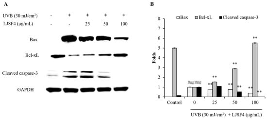 The Bax/Bcl-xL and cleaved caspase-3 levels of UVB-irradiated HaCaT cells were measured by Western blot analysis. As shown in Figure 4, the UVB irradiation increased the Bax level and decreased the Bcl-xL level, while pre-treatment with LJSF4 significantly increased the Bcl-xL level and decreased the Bax level in a dose-dependent manner. Moreover, LJSF4 reduced UVB-induced cleaved caspase-3 activation in UVB-irradiated HaCaT cells. These results indicate that LJSF4 inhibited UVB-induced apoptosis by the regulation of Bax, Bcl-xL and cleaved caspase-3 levels. The anti-UVB activity of Sargachromenol extracted from the brown seaweed of Sargassum micracanthum has been investigated, and the similar pathway by regulation of Bax, Bcl-xL and cleaved caspase-3 levels has been reported []. In addition, fucoidans isolated from different brown algae have been reported to inhibit UVB-induced photoaging through other signaling pathways, such as by inhibiting the MAPK pathways related to NF-κB and AP-1, by inhibiting MMP-1 expression via blocking the signal pathways of p38, JNK, and ERK [,]. Thus, the S. japonica fucoidan showed a different anti-UVB pathway to those of other reported fucoidan via regulating the expression of Bax, Bcl-xL and cleaved caspase-3.