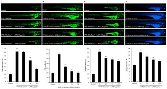 The effect of LJSF4 on UVB-irradiated zebrafish: (A) effect of LJSF4 on UVB-irradiated ROS generation in zebrafish; (B) effect of LJSF4 on UVB-irradiated cell death levels in zebrafish; (C) effect of LJSF4 on UVB-irradiated NO level in zebrafish; (D) effect of LJSF4 on UVB-irradiated lipid peroxidation levels in zebrafish. Zebrafish embryos at 2 days post-fertilization (dpf) were used for the anti-UVB study. Data are expressed as means ± standard error of the means (S.E.M). ** p < 0.01 as compared to the UVB-treated group and ## p < 0.01 as compared to the control group.