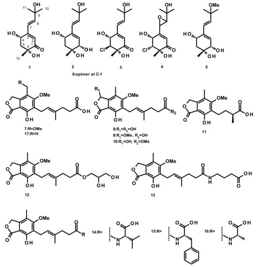 Six merohemiterpenes (Figure 1), acremine A (1), acremine F (2), 5-choloroacremine A (3), 5-choloroacremine H (4), 9-O-methylacremine F (5) and 1-epi-acremine F (6), were obtained from the culture of the marine-derived fungus Acremonium persicinum, which was isolated from the marine sponge Anomoianthella rubra. None of the isolated compounds were assayed for any biological activity [22]. Mycophenolic-acid-based merohemiterpenes 7–17 (Figure 1) were isolated from Penicillium bialowiezense, which was obtained from the soft coral Sarcophyton subviride. Compounds 7–17 exhibited an inhibitory activity against inosine-50-monophosphate dehydrogenase (IMPDH2) with IC50 values ranging from 0.59 to 24.68 µM. These compounds were also assayed for the in vitro immunosuppressive activity against the proliferation of T-lymphocytes, and 7–9 exhibited IC50 values ranging from 0.84 to 0.95 µM, whereas the IC50 values of 10–17 were from 3.27 to 24.68 µM [23].