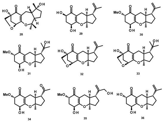 Chemical investigation of the endophytic fungus A1, isolated from leaves of the mangrove plant Scyphiphora hydrophyllacea, afforded the previously unreported guignardones F–I (29–32), together with the previously described guignardones A (33) and B (34) (Figure 3). Compound 32 displayed antibacterial activity against methicillin-resistant Staphylococcus aureus (MRSA) and S. aureus with inhibition zones of 9.0 and 11.0 mm, respectively, whereas 34 exhibited inhibition activity against MRSA with a minimum inhibitory concentration (MIC) value of 65 µM [26]. The previously unreported guignardones J (35), K (36), M (37) (Figure 3), along with 31, 33 and 34, were obtained from the culture extract of the endophytic fungus Aspergillus flavipes AIL8, which was isolated from the inner leaves of the mangrove plant Acanthus ilicifolius. The isolated compounds showed neither antibacterial nor cytotoxic activities [27].