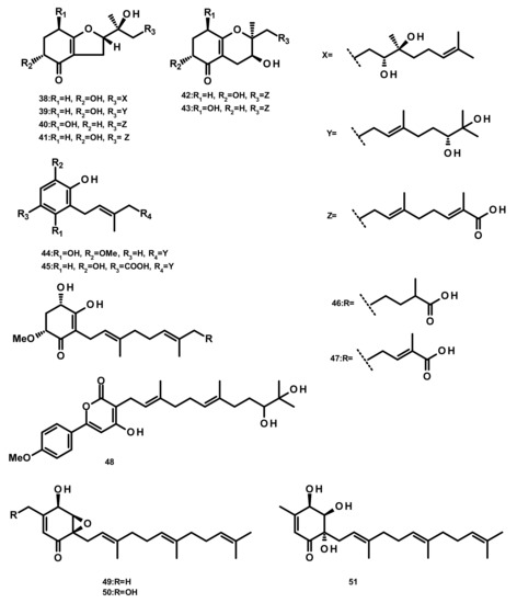 Merosesquiterpenes 38–47 (Figure 4) were isolated from the marine-derived fungus Alternaria sp. JJY-32, which was obtained from the marine sponge Callyspongia sp. Supplementation experiments with specific enzyme inhibitors and putative precursors led to the conclusion that they are originated from a shikimate-isoprenoid hybrid biosynthetic pathway. All the compounds, except 44, displayed NF-κB inhibitory activities with IC50 values ranging from 39 to 85 μM in RAW264.7 cells [28]. Another merosesquiterpene named arisugacin I (48) (Figure 4), was obtained from the endophytic fungus Penicillium sp. SXH-65, which was isolated from the leave of Tamarix chinensis growing on a saline-alkaline soil on the coast of Laizhou Bay in Dongying, China. Compound 48 showed no cytotoxicity against HL-60 (human leukemia), K562 (chronic myelogenous leukemia) and Hela (cervix carcinoma) cells [29]. 7-Deacetoxyyanuthone A (49), 2,3-hydrodeacetoxyyanuthone A (50), 22-deacetylyanuthone A (51) (Figure 4), three merosesquiterpenes featuring a quinone/hydroquinone scaffold, were isolated from the marine-derived fungus Gliomastix sp. ZSDS1-F7, obtained from the marine sponge Phakellia fusca Thiele, which was collected on the Yongxing island of Xisha. Compound 50 displayed significant in vitro cytotoxicity against several cancer cell lines including K562, MCF-7 (breast cancer), Hela, DU145 (prostate cancer), U937 (myeloid leukaemia), H1975 (nonsmall lung cancer), SGC-7901 (gastric cancer), A549 (lung carcinoma), MOLT-4 (acute lymphoblastic leukemia) and HL-60, with IC50 values ranging from 0.19 to 35.4 μM. Moreover, 49 displayed a moderate antitubercular activity with an IC50 value of 17.5 μM [30].