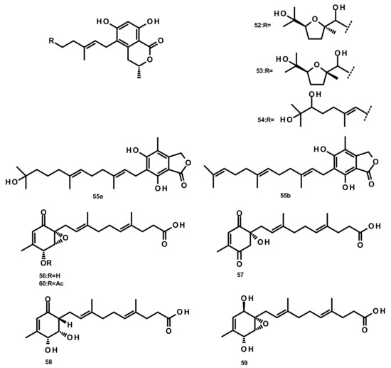 Verruculides B2 (52), B3 (53) and B (54) (Figure 5) were isolated from the fungus Penicillium sp. SCS-KFD09 which was obtained from a marine worm, Sipunculus nudus. Compound 52 showed weak antibacterial activity against S. aureus, with a MIC value of 32 μg/mL [31]. A farnesyl phthalide derivative 55a and its previously reported analogue 55b (Figure 5) were isolated from the marine sediment-derived fungus Penicillium rudallense. Compound 55a did not significantly suppress receptor activator of nuclear factor κB ligand (RANKL)-induced osteoclast differentiation [32]. Five farnesylcyclohexenone derivatives, peniginsengins A–E (56–60) (Figure 5), were isolated from the culture extract of Penicillium sp. YPGA11 which was obtained from deep-sea water at a depth of 4500 m in the Yap Trench (West Pacific Ocean). The absolute configurations of their stereogenic carbons were established by comparison of the calculated and experimental electronic circular dichroism (ECD) spectra. Compounds 57–60 displayed weak to moderate antibacterial activity against S. aureus ATCC 25,913 and S. aureus ATCC 43,300 with MIC values of 8–32 μg/mL [33].