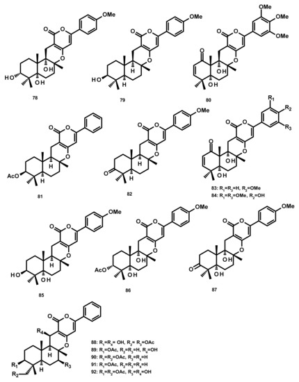 Three merosesquiterpenes containing a phenyl α-pyrone, arigsugacin I (78), arigsugacin F (79) and territrem B (80) (Figure 8), were isolated from the endophytic fungus Penicillium sp. sk5GW1L, which was obtained from the leaves of the mangrove plant Kandelia candel. Compounds 78–80 displayed a potent in vitro inhibitory activity against AChE, with IC50 values of 0.64 ± 0.08 µM, 0.37 ± 0.11 µM, and 7.03 ± 0.20 nM, respectively [37]. Another merosesquiterpene containing a phenyl α-pyrone, S14-95 (81) (Figure 8), was obtained from the marine sponge-associated fungus Aspergillus similanensis KUFA 0013, which was isolated from the marine sponge Rhabdermia sp. Compound 81 was evaluated for its antimicrobial activities against a panel of Gram-positive (S. aureus ATCC 25,923 and B. subtilis ATCC 6633) and Gram-negative bacteria (E. coli ATCC 25,922 and P. aeruginosa ATCC 27,853) and yeast (Candida albicans ATCC 10,231); however no activities were observed (MIC > 256 µg/mL) [38]. Arisugacin J (same as arigsugacin I, 78), arisugacin F (same as arigsugacin F, 79), arisugacin G (82), arisugacin B (83), territrem C (84 (Figure 8)) and territrem B (80) were obtained from the endophytic fungus Penicillium sp. SXH-65, which was isolated from the leave of Tamarix chinensis. Compounds 82 and 83 exhibited weak cytotoxicity toward HL-60, K562 and Hela cell lines with IC50 values of 24.2, 36.2, 59.9 and 45.9, 46.6, 44.4 μM, respectively [29]. Chemical examination of the mangrove-derived fungus Penicillium sp., isolated from the leaves of the mangrove plant Kandelia candel, yielded 3-epi-arigsugacin E (85) arisugacin D (86), terreulactone C (87) (Figure 8) and the previously mentioned arisugacin B (83) and territrem C (84). Compounds 83–85 displayed potent AChE inhibitory activity with IC50 values of 3.03, 0.23 and 0.028 μM, respectively [39]. Ding et al. [40] reported the isolation of two previously unreported phenylpyropenes E (88) and F (89), together with the previously described phenylpyropenes B (90), C (91), and D (92) (Figure 8), from the culture of the marine-derived fungus Penicillium concentricum ZLQ-69 which was isolated from the water samples taken from the coast of the Bohai Sea in Binzhou, Shandong Province, China. Compounds 88–92 were assayed for their in vitro cytotoxicity against three human cancer cell lines, A549, MGC-803 (gastric cancer) and HL-60 by the MTT method. However, only 88 and 92 exhibited moderate cytotoxicity against the MGC-803 cell line with IC50 values of 19.1 and 13.6 μM, respectively.
