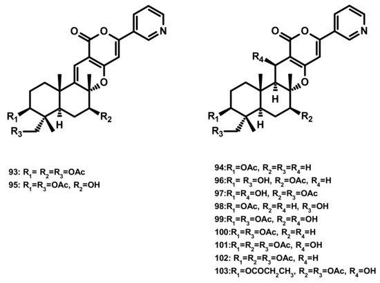 Pyripyropenes S (93) and E (94), and the previously unreported pyripyropene T (95) (Figure 9) were isolated from the marine sponge-associated fungus Aspergillus similanensis KUFA 0013. Compounds 93, 94 and 95 showed neither antibacterial nor antifungal activities against a panel of Gram-positive (S. aureus ATCC 25,923 and B. subtilis ATCC 6633) and Gram-negative bacteria (E. coli ATCC 25,922 and P. aeruginosa ATCC 27,853) and yeast (C. albicans ATCC 10,231) with MIC > 256 µg/mL [38,41]. Besides two previously unreported pyripyropene derivatives, 13-dehydroxy-1,11 deacetylpyripyropene A (96) and 1-deacetylpyripyropene A (97) (Figure 9), six previously described pyripyropenes, namely 94, 11-deacetylpyripyropene O (98), 7-deacetylpyripyropene A (99), pyripyropenes O (100) and A (101) and 13-dehydroxypyripyropene A (102) (Figure 9) were isolated from the marine-derived fungus Fusarium lateritium 2016F18-1, which was isolated from the marine sponge Phyllospongia foliascens. Compounds 98, 100 and 101 exhibited significant cytotoxicity against five human cancer cell lines, i.e., CNE1 (nasopharyngeal carcinoma), CNE2 (nasopharyngeal carcinoma), HONE1 (nasopharyngeal carcinoma), SUNE1 (spectrin repeat containing nuclear envelope protein 1), GLC82 (lung carcinoma) cancer cell lines as well as HL7702 (normal hepatic) cells [42]. Compounds 99, 101 and 102 were also isolated from the marine-derived fungus Neosartorya pseudofischeri which was obtained from the inner tissue of the starfish Acanthaster planci. Compounds 99, 101 and 102 exhibited significant cytotoxicity against Sf9 cells, highlighting them for a prospective platform for biorational pesticides development [43]. Compounds 94, 100, 101 and pyripyropene B (103) (Figure 9) were reported from the marine-derived fungus Penicillium concentricum ZLQ-69; however they were not assayed for any bioactivity [40].