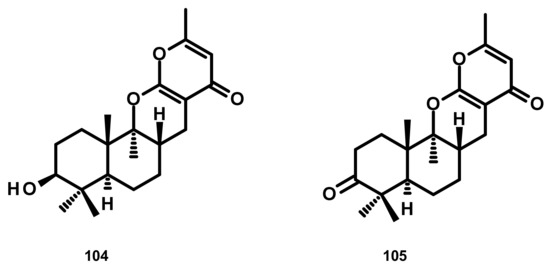 Penicillipyrones A (104) and B (105) (Figure 10), two merosesquiterpenes containing a 4-pyrone moiety, were isolated from the marine-derived fungus Penicillium sp. F446, which was obtained from marine sediments at the depth of 25 m collected from Geomun-do (Island), Korea. Compound 104 exhibited significant induction of quinone reductase in a dose-dependent manner in murine Hepa 1c1c7 (murine hepatoma) cells over the concentration range 5–40 μM [44].
