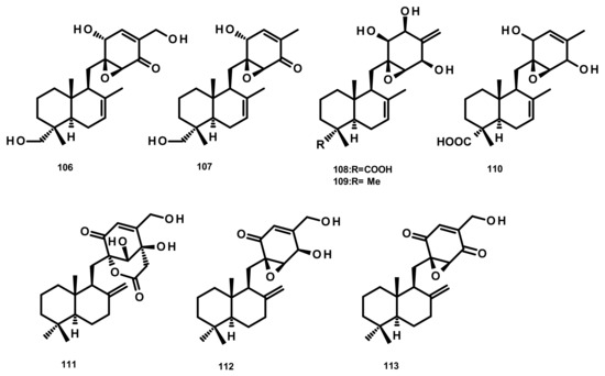 Epoxyphomalins A (106) and B (107) (Figure 11) were isolated from the culture extract of the marine-derived fungus Paraconiothyrium cf. sporulosum (initially identified as Phoma sp. 193H12), obtained from the marine sponge Ectyplasia perox, which was collected from the Caribbean Sea. Compounds 106 and 107 displayed significant antiproliferative activity against a panel of 36 human tumour cell lines with IC50 values of 0.11 and 1.25 µg/mL, respectively [45]. Further investigation of the same fungus by the same research group has resulted in the isolation of three new analogues which were named epoxyphomalins C (108), D (109) and E (110) (Figure 11). Compounds 108–110 were evaluated for their cytotoxicity against the same panel of 36 tumour cell lines. Although 108 and 110 were inactive at a concentration of 27.6 μM, 109 displayed a selective cytotoxicity, particularly against the prostate PC3M and bladder BXF 1218 L cancer cell lines with IC50 values of 0.72 and 1.43 μM, respectively [46]. Purpurogemutantin (111), macrophorin A (112) and 4′-oxomacrophorin (113) (Figure 11), three merosesquiterpenes featuring a quinone/hydroquinone scaffold, were isolated from the marine sponge-associated fungus Gliomastix sp. ZSDS1-F7, which was obtained from the marine sponge Phakellia fusca collected on the Yongxing island of Xisha, China. Compounds 111–113 showed significant in vitro cytotoxicity against various cancer cell lines including K562, MCF-7, Hela, DU145, U937, H1975, SGC-7901, A549, MOLT-4 and HL-60, with IC50 values ranging from 0.19 to 35.4 μM. Moreover, 112 and 113 displayed a moderate antitubercular activity with IC50 values of 22.1 and 2.44 μM, respectively [30].